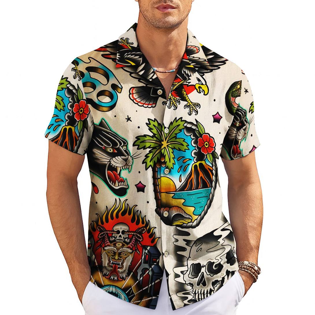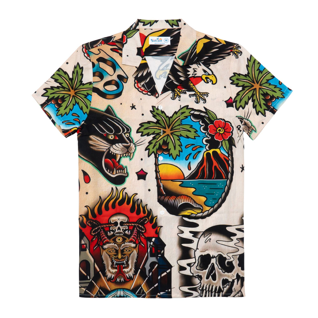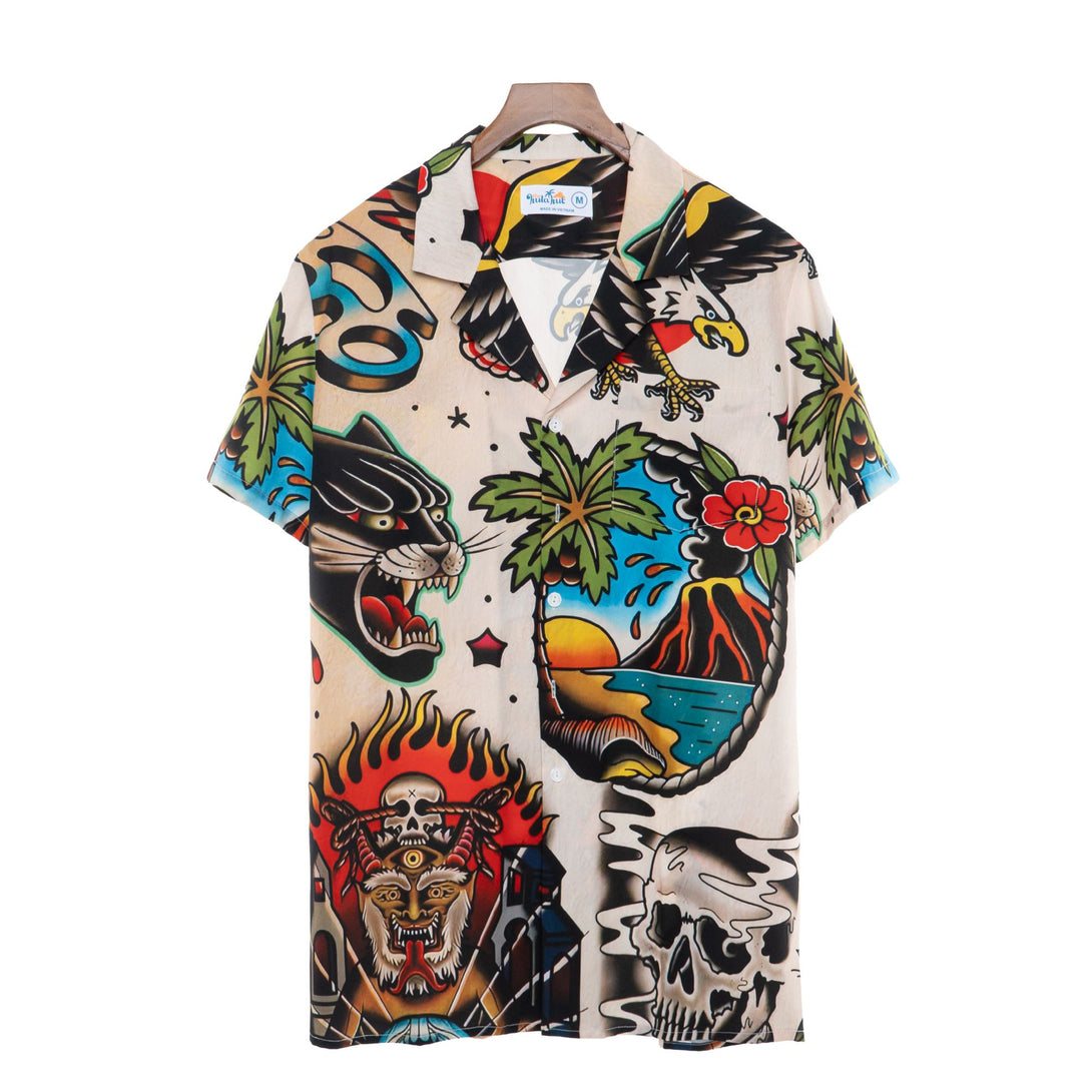 Express your rebellious side with this vintage-inspired Hawaiian shirt featuring classic tattoo artwork including skulls, eagles, and traditional American imagery. Perfect for music festivals, biker gatherings, and alternative summer events, this edgy design appeals to rockabilly enthusiasts. Ideal for men who embrace vintage culture and want to showcase their alternative style with tropical comfort.