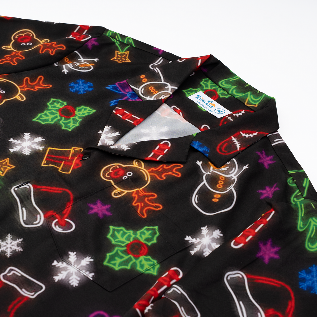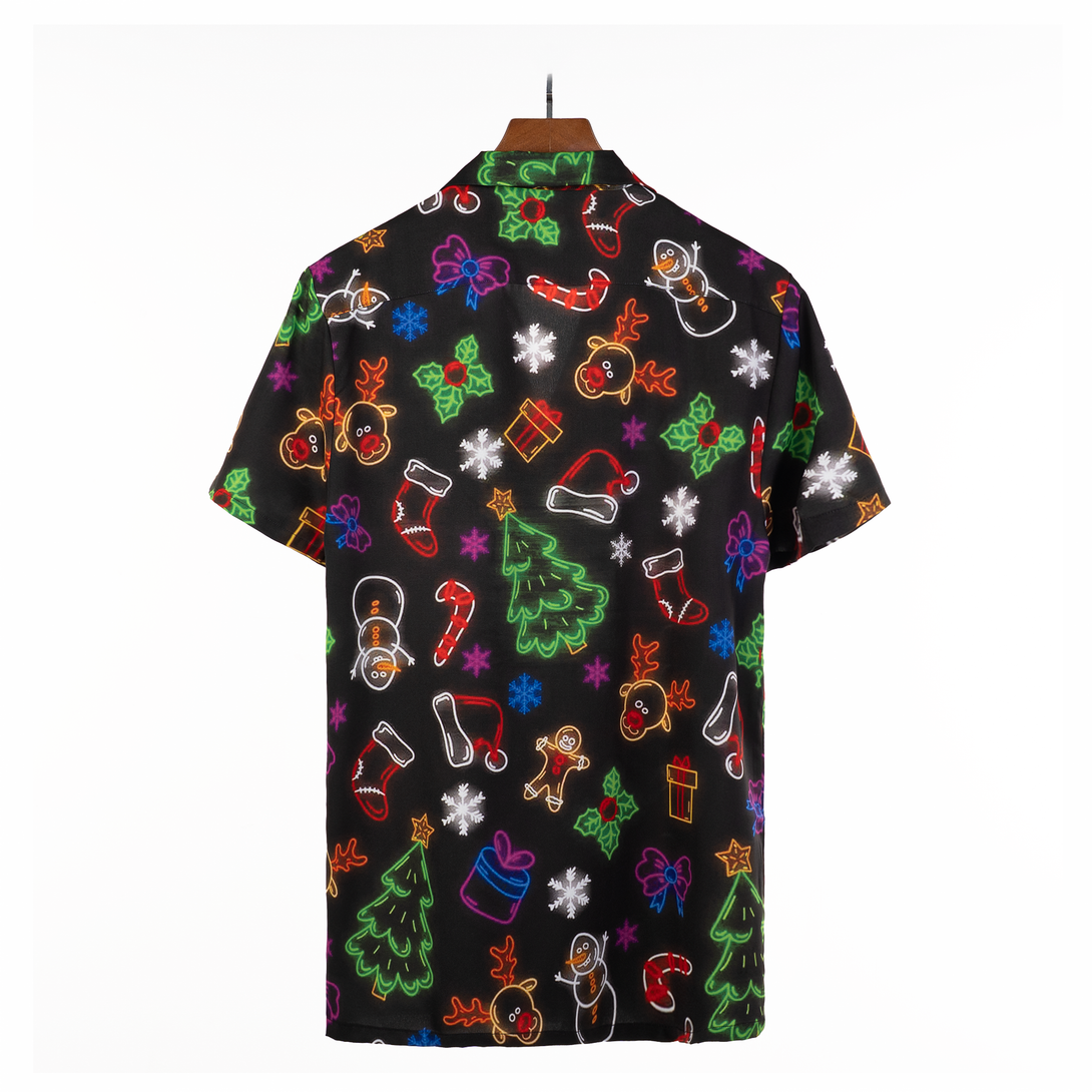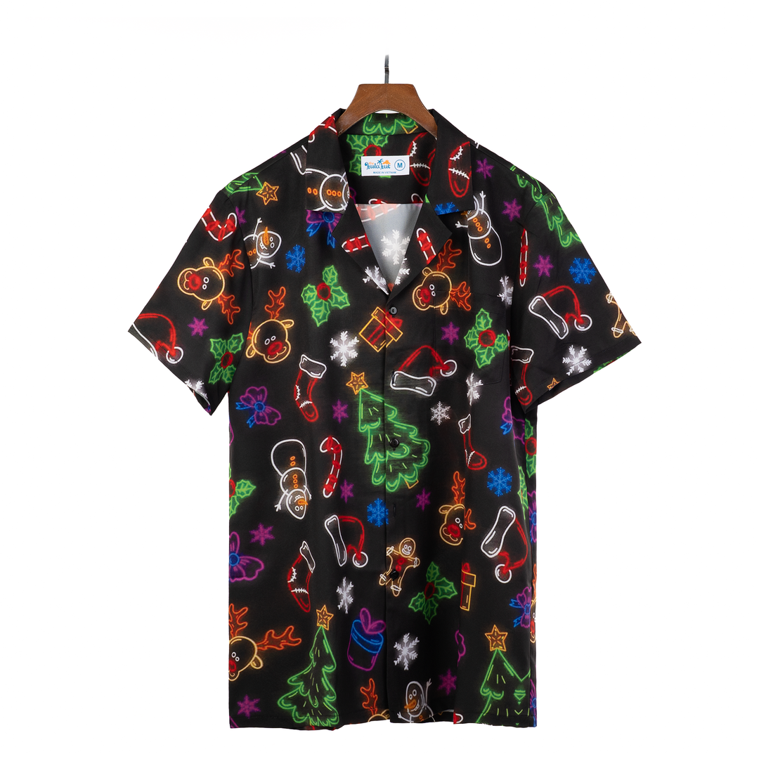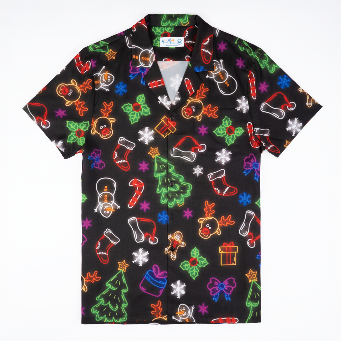 Featuring bright neon Christmas elements including gingerbread men on a black background, this eye-catching Hawaiian shirt is perfect for holiday parties and festive nightlife. Ideal for Christmas celebrations, holiday club nights, or anyone wanting to stand out at festive gatherings. Great gift for party-goers who love bold, colourful holiday fashion.