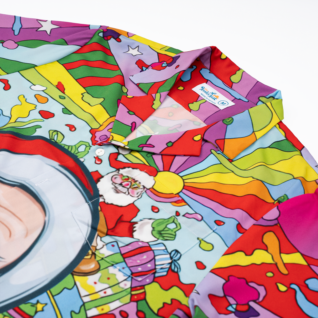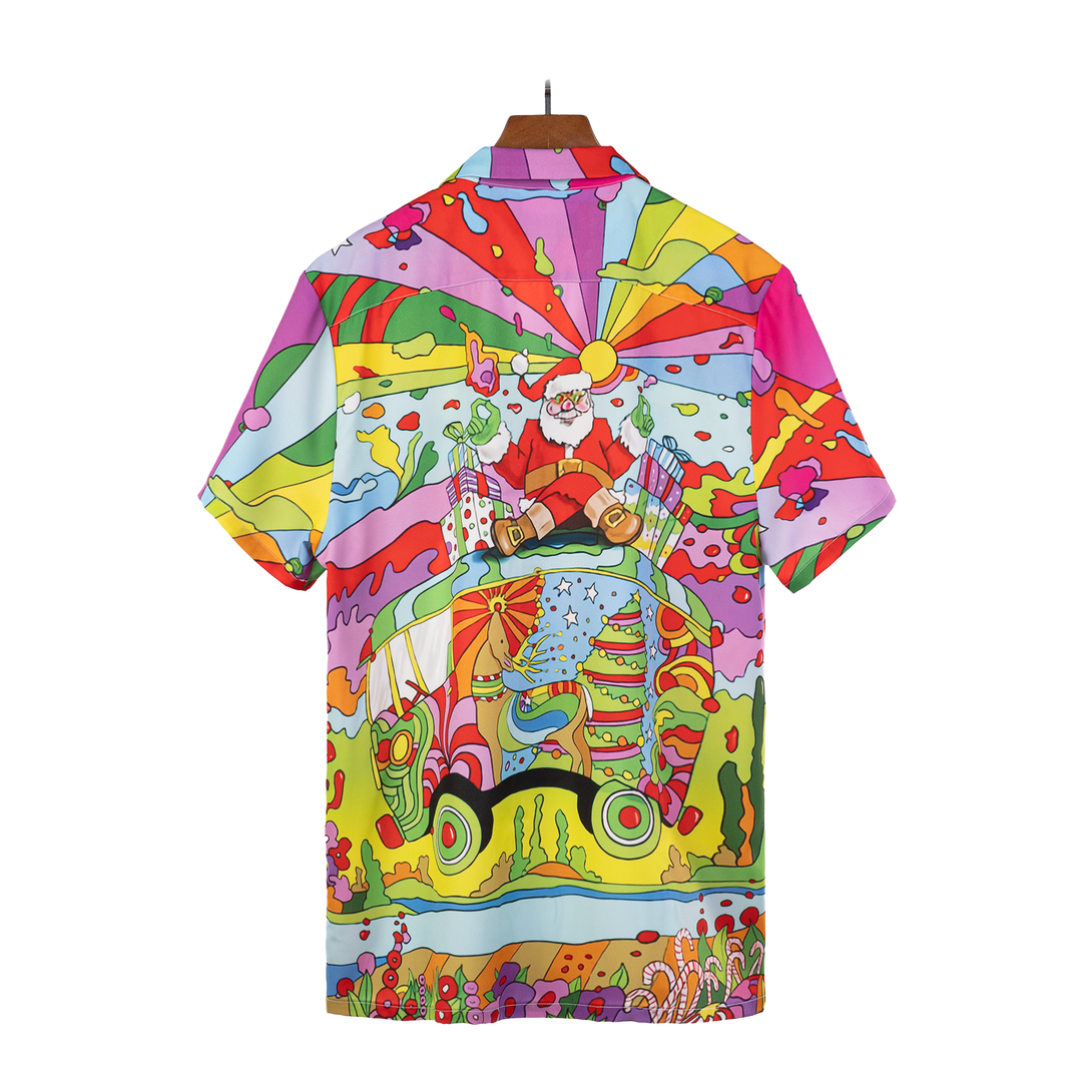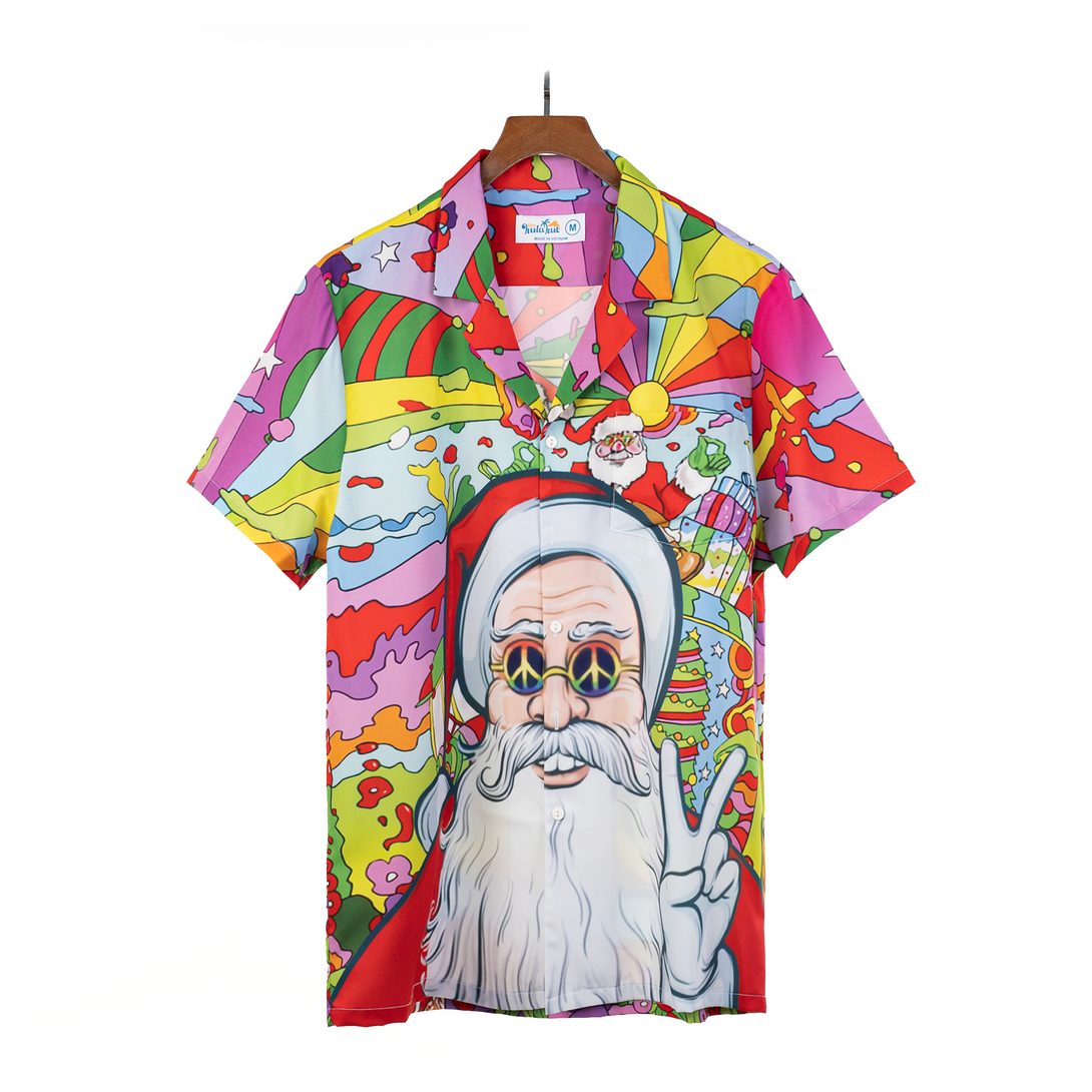 Spread peace and holiday cheer with this groovy Hawaiian shirt featuring psychedelic Santa designs and vibrant rainbow colours. Perfect for alternative Christmas parties, music festivals, and creative holiday celebrations, this unique design appeals to free-spirited individuals. Ideal for men who embrace counterculture and want to celebrate Christmas with a fun, unconventional twist.