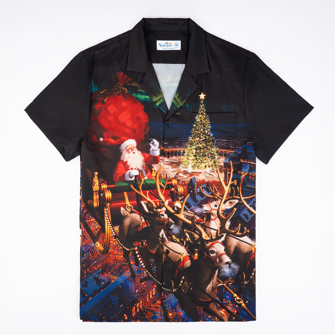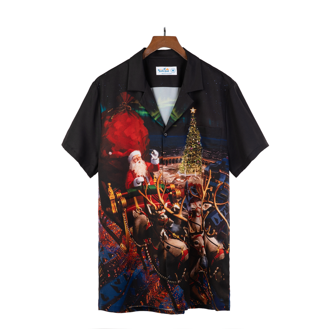 This festive Hawaiian shirt features Santa and his reindeer in a magical Christmas night scene, perfect for celebrating the holidays in warm weather. Ideal for Christmas parties, holiday gatherings, or anyone wanting to embrace festive spirit during summer. A unique gift for Christmas enthusiasts who love tropical-style holiday apparel.