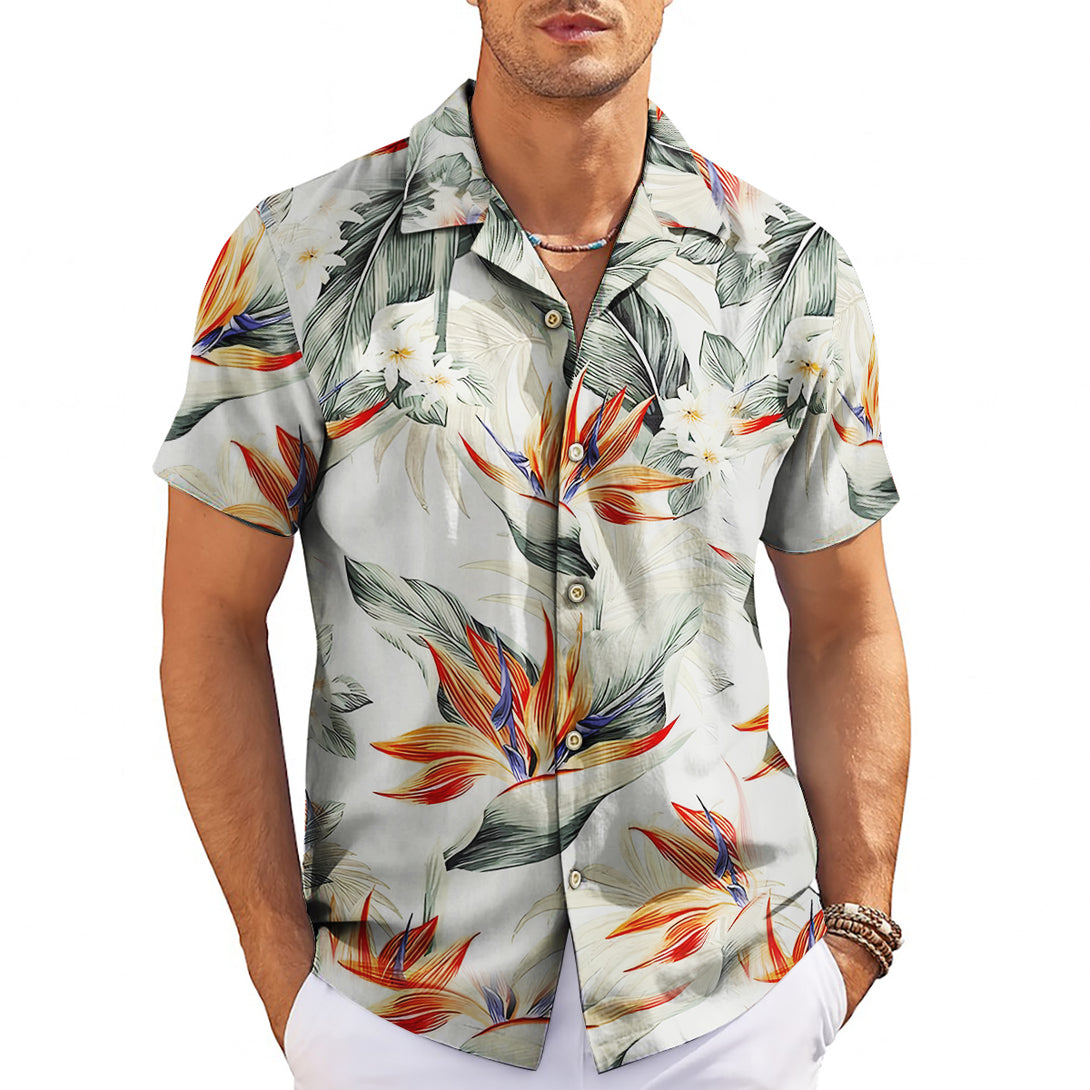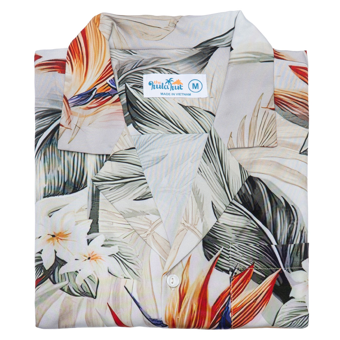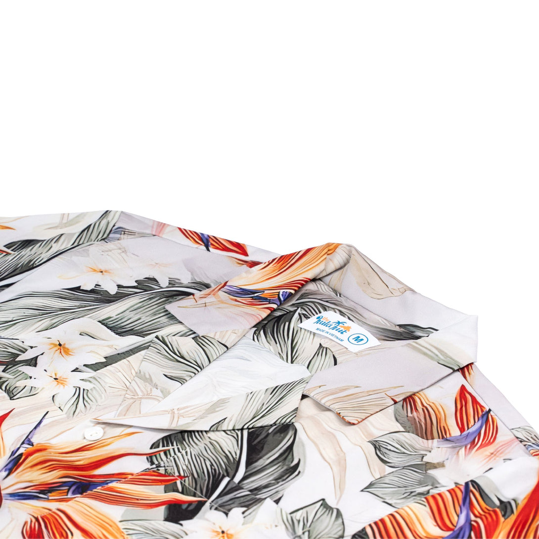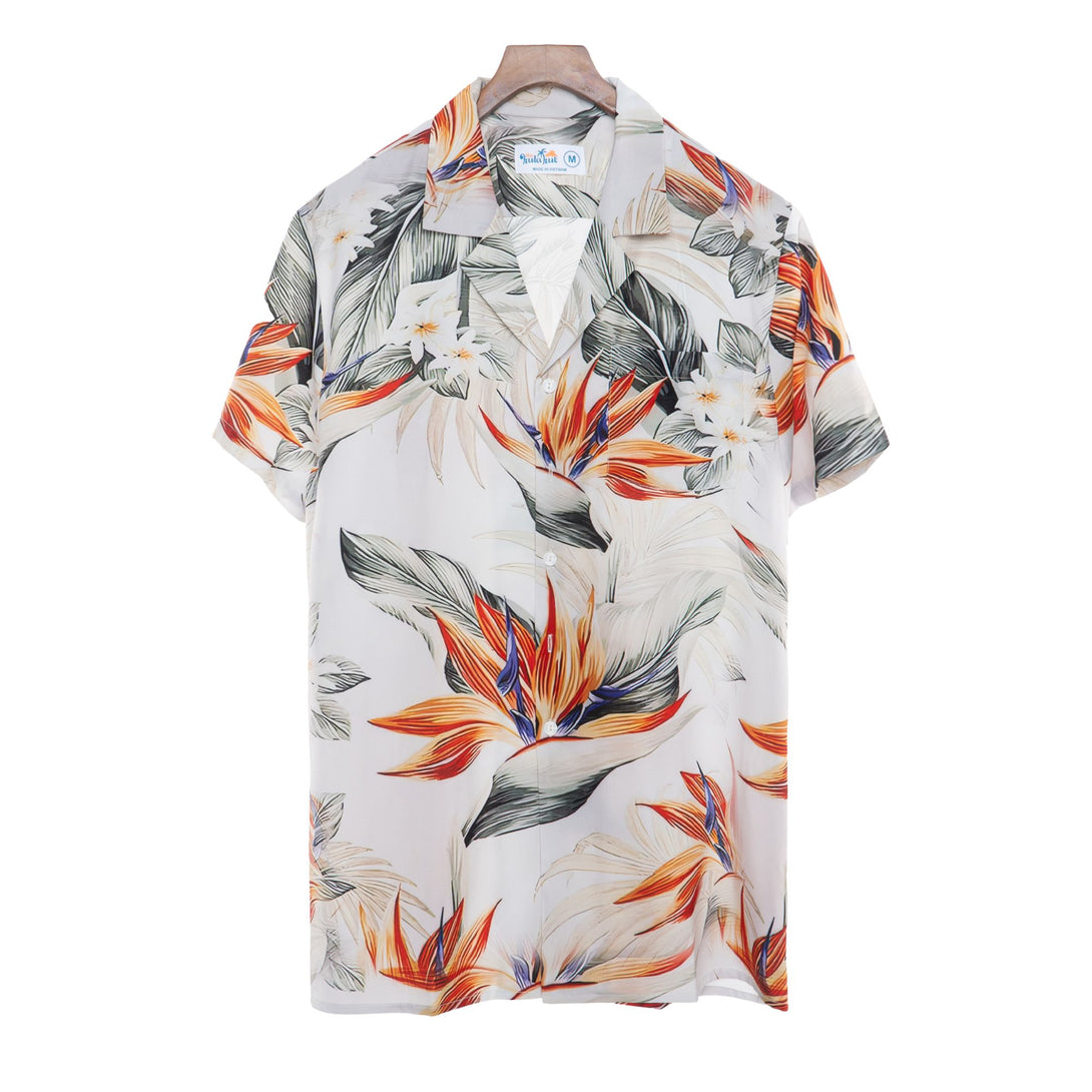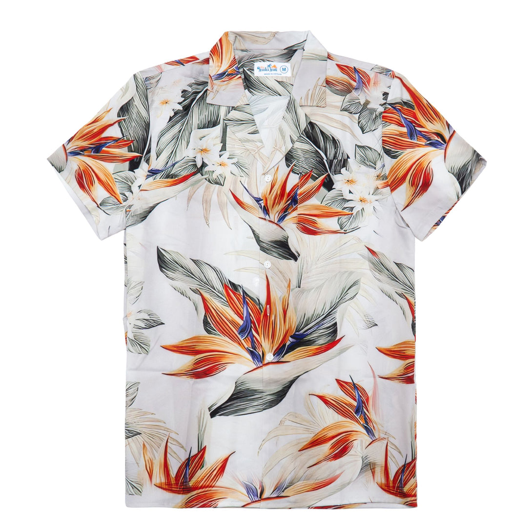 Embrace tropical paradise with this stunning white Hawaiian shirt featuring vibrant bird of paradise florals and exotic leaf patterns. Perfect for beach holidays, resort dinners, and summer weddings, this elegant design offers sophisticated island style. Ideal for men who appreciate refined tropical fashion and want to make a stylish statement at upscale vacation destinations.