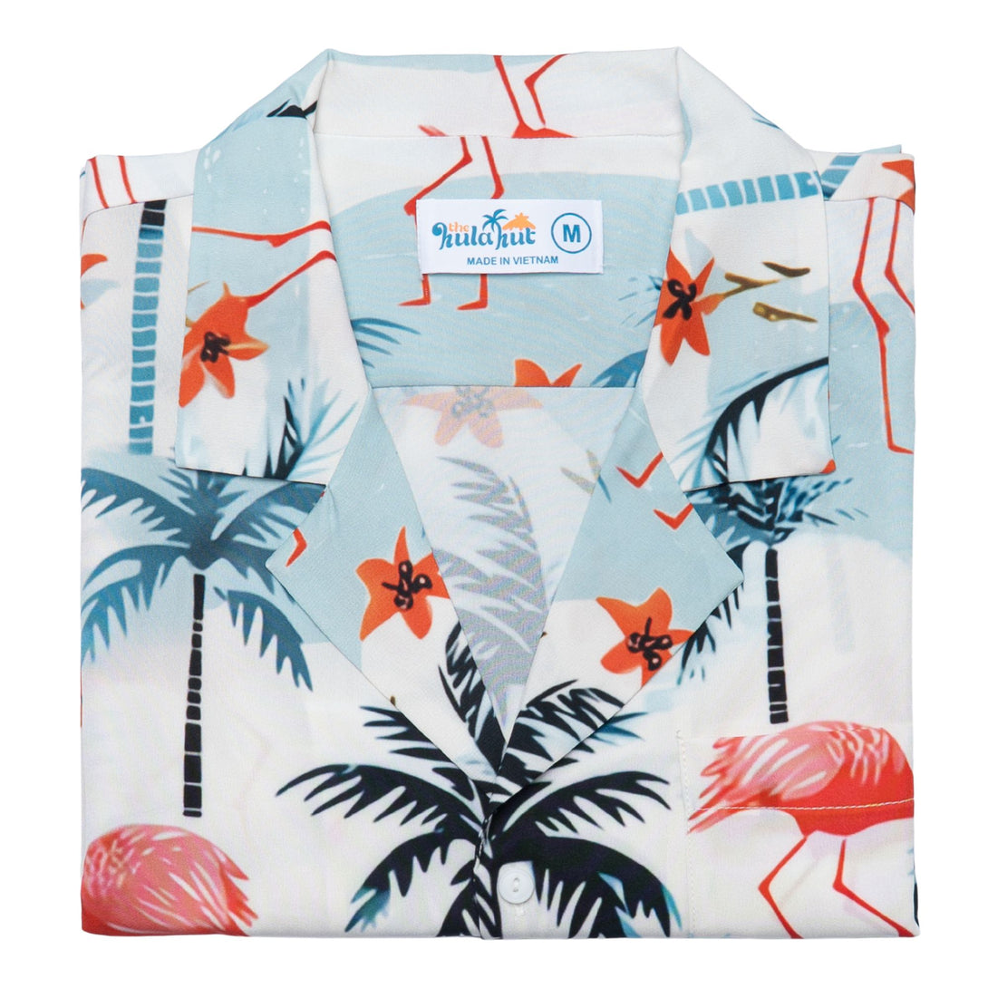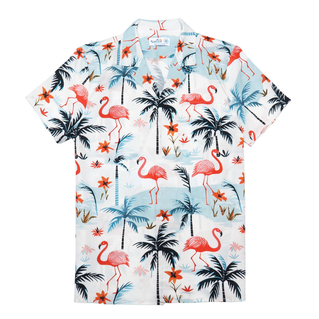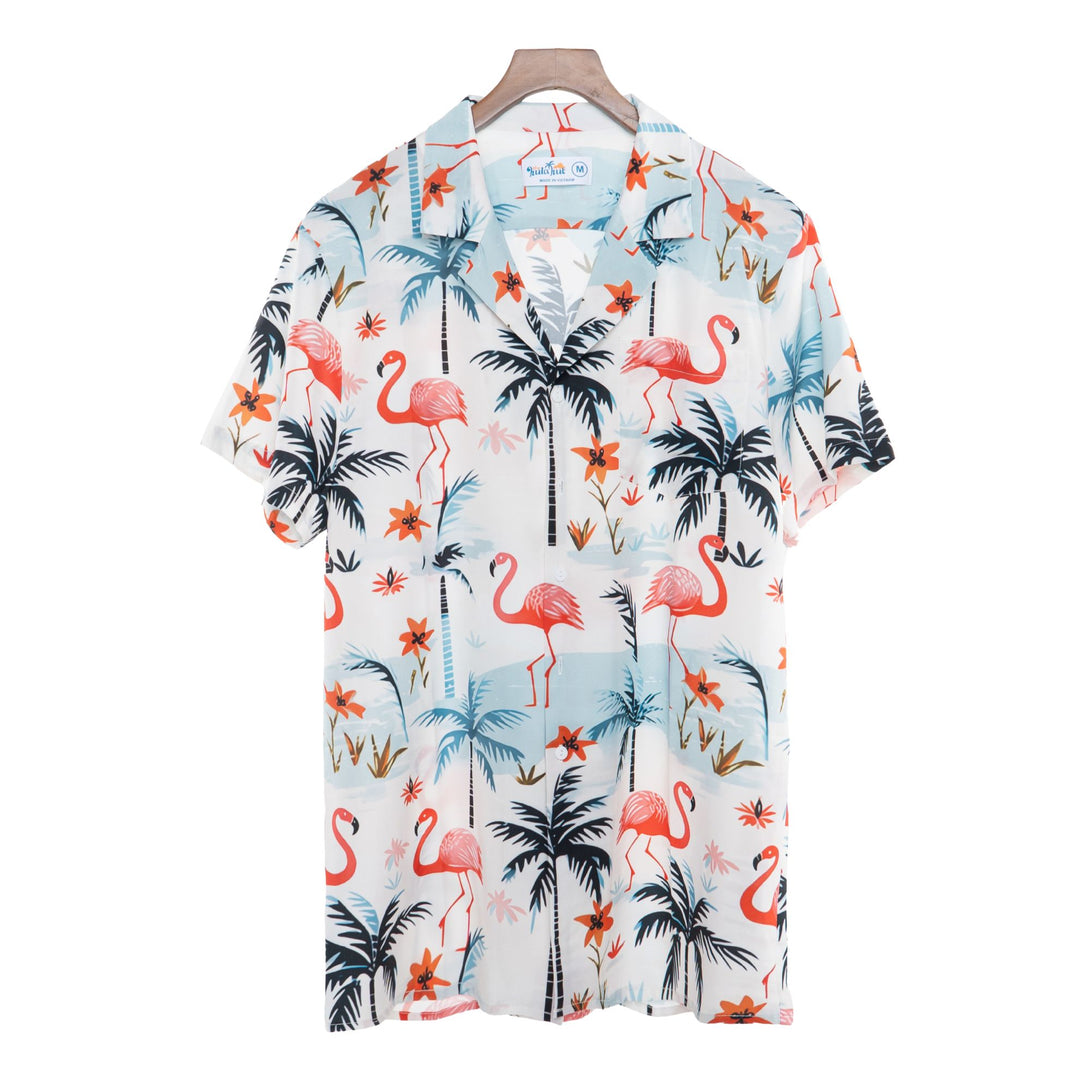 Step into pink paradise with this elegant Hawaiian shirt featuring graceful flamingos among tropical palm trees and island scenery. Perfect for beach resorts, romantic getaways, and summer weddings, this sophisticated design offers refined tropical charm. Ideal for style-conscious men who appreciate distinctive wildlife prints while maintaining an elegant appearance for special vacation moments.