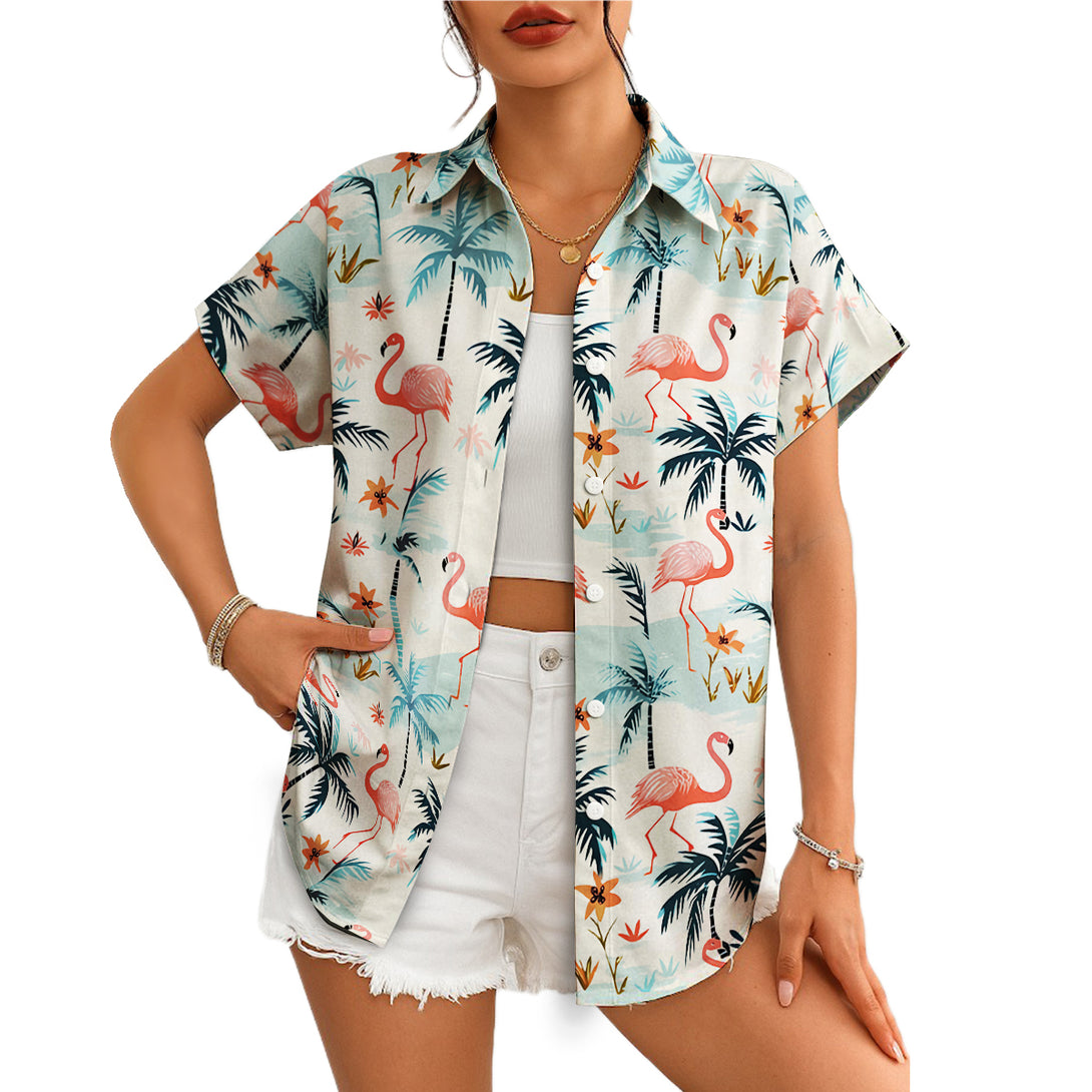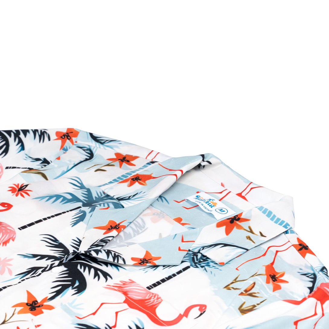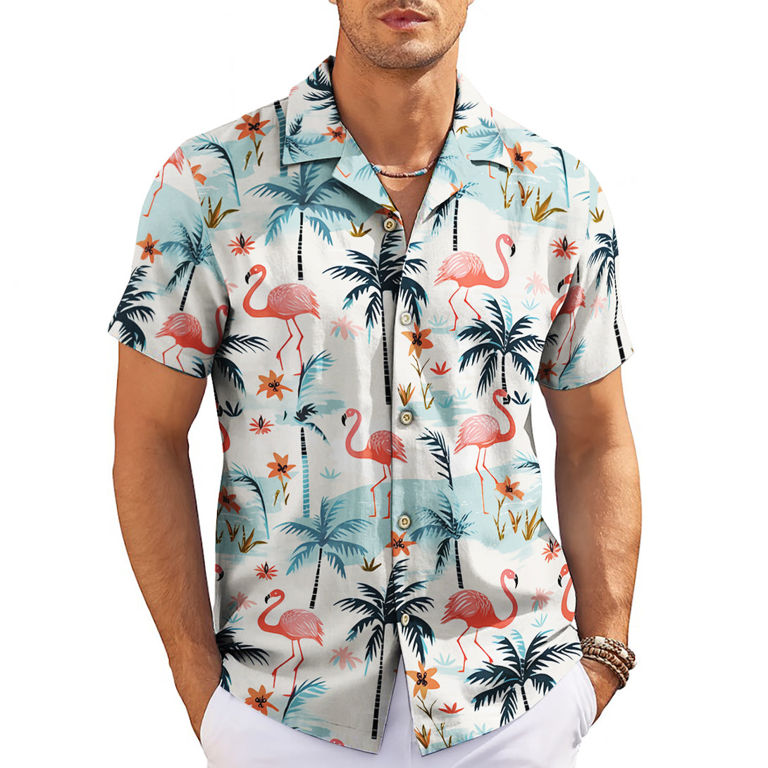 Step into pink paradise with this elegant Hawaiian shirt featuring graceful flamingos among tropical palm trees and island scenery. Perfect for beach resorts, romantic getaways, and summer weddings, this sophisticated design offers refined tropical charm. Ideal for style-conscious men who appreciate distinctive wildlife prints while maintaining an elegant appearance for special vacation moments.